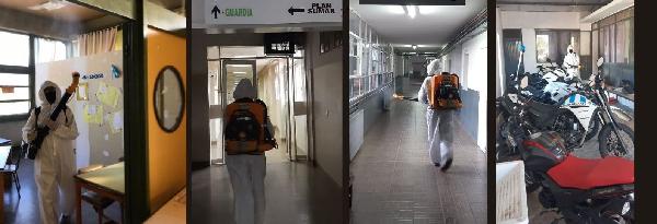 En el Departamento de General Alvear se está trabajando fuertemente en la desinfección de Escuelas, Comisarías, el Hospital Enfermeros Argentinos, diversos sanatorios, oficinas de ATM, el Concejo Deliberante, PAMI, Cáritas y otras instituciones donde el tránsito público es asiduo.