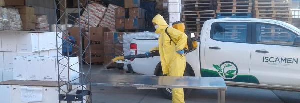 Las brigadas de desinfección del ISCAMEN trabajaron durante el día de la fecha en el Centro de Almacén y Logística del Ministerio de Salud de la provincia.